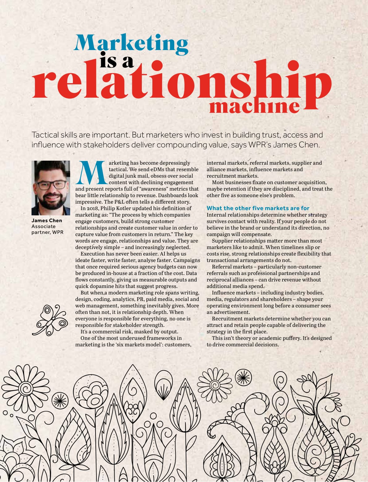 WPR’s James Chen was recently featured in NZ Marketing Magazine, focusing on how relationships are more vital today than campaigns, content, and quick wins. In his article, he explains how marketing is a relationship machine; creating value by building trust, influence, and strong connections with the groups that help build long-term commercial value that still stands a decade from now.